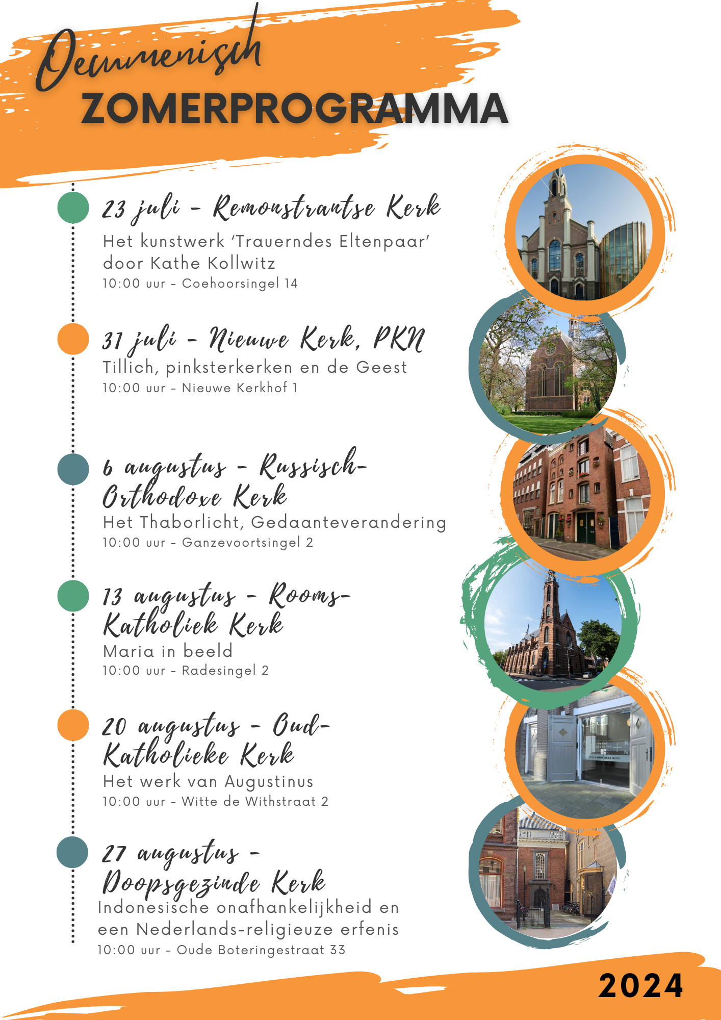 Ook dit jaar is er weer een gezamenlijk zomerprogramma, georganiseerd door verschillende kerken in de binnenstad die onderdeel uitmaken van de Raad van Kerken. Wekelijks is er op dinsdag ochtend (en 1x op woensdagochtend) een interessant programma in één van de kerken, voorbereid door de plaatselijk voorganger, pastoor of een gemeentelid. Van harte welkom!